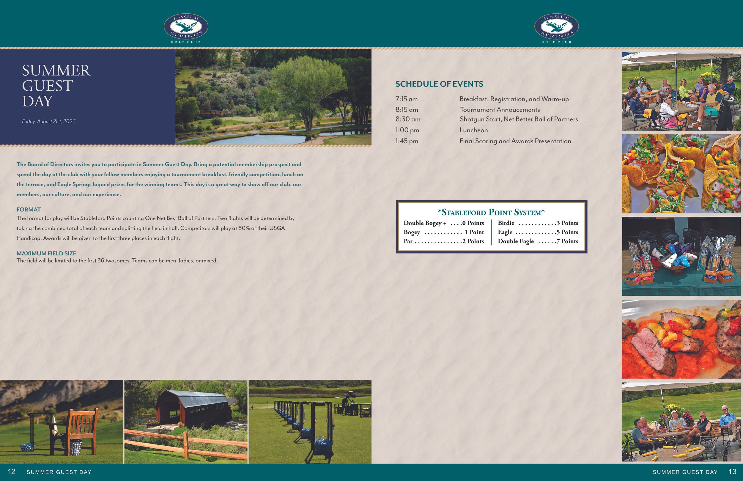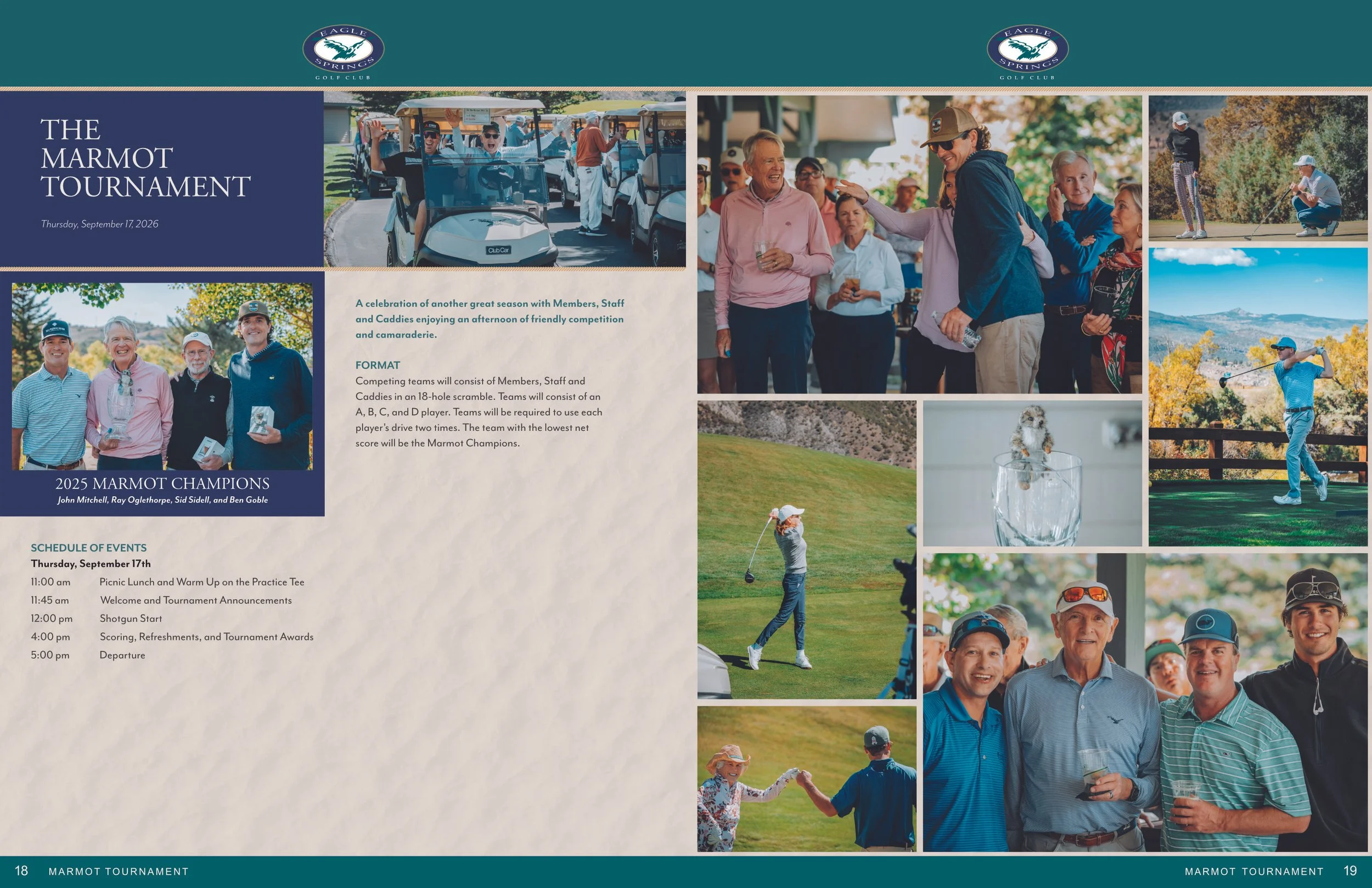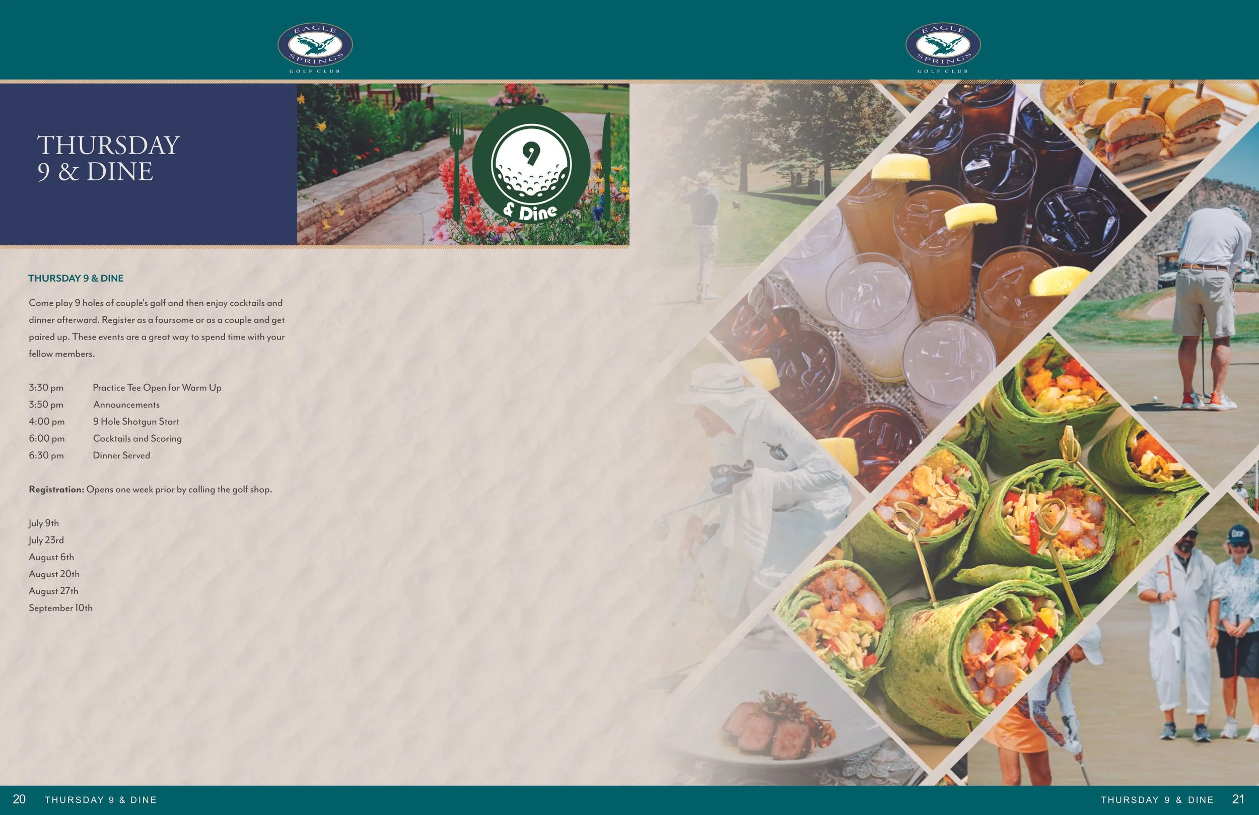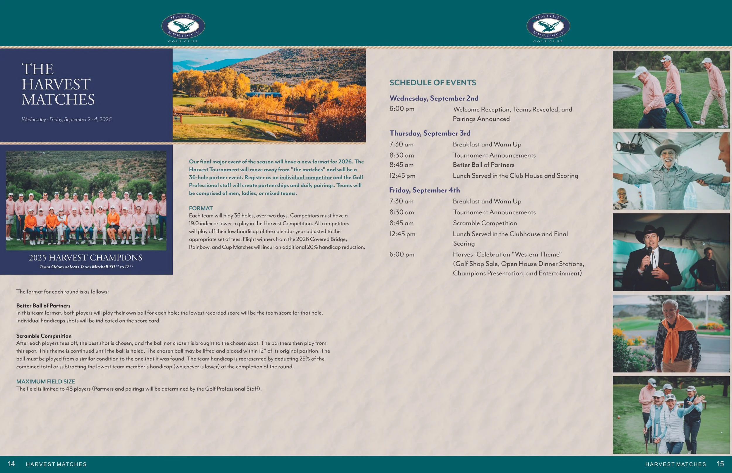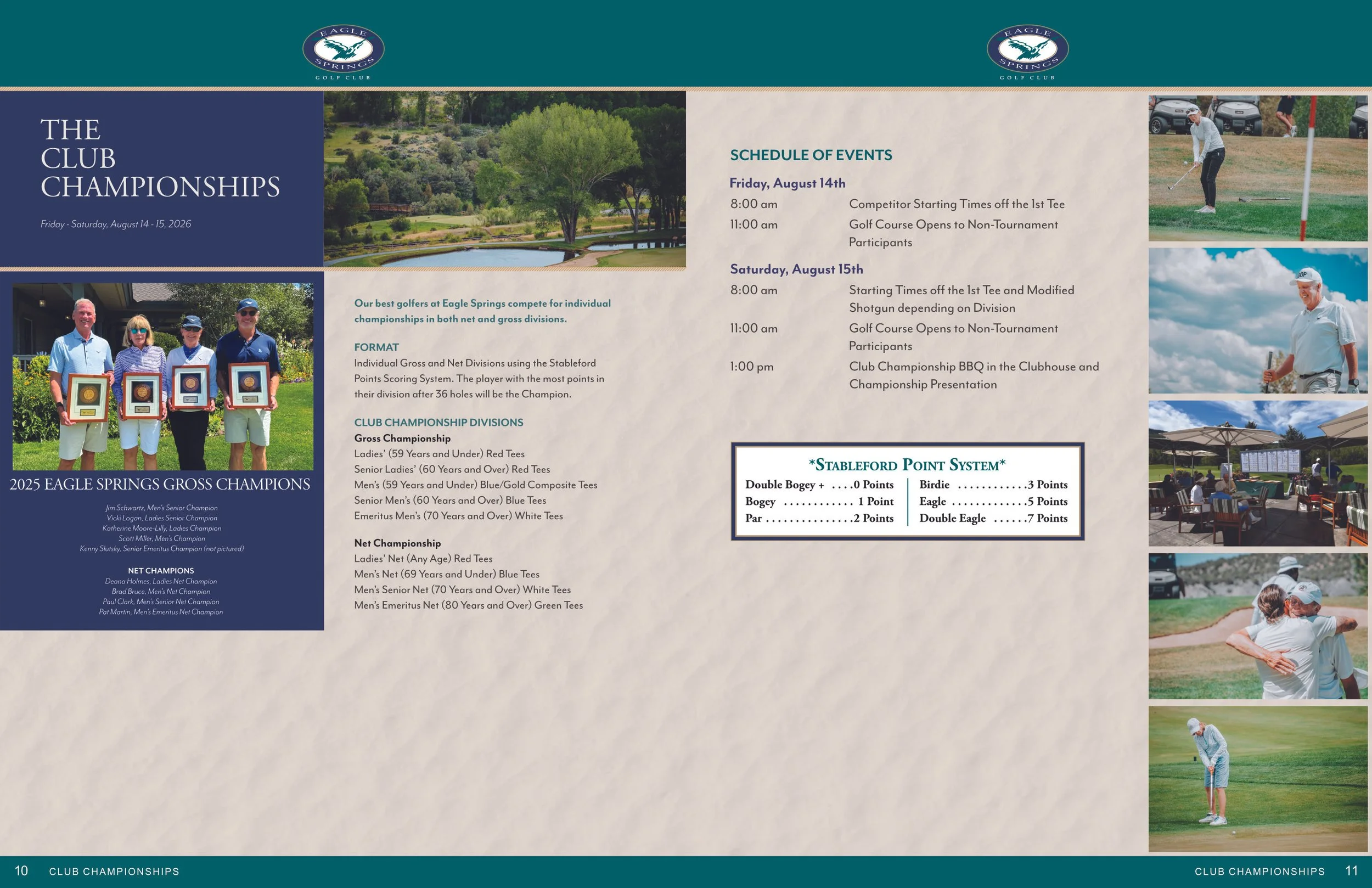 This is a tournament brochure that I worked on for Eagle Springs Golf Club. Much of the work was done by the previous designer, but I made changes where I could. Most of the pictures on the right side of the pages were chosen and arranged by me. I also created the picture collages on the final few pages, with what limited options I had. The front cover was completely designed by me, but the back cover is from the previous version. I also changed the background to something resembling bunker sand.