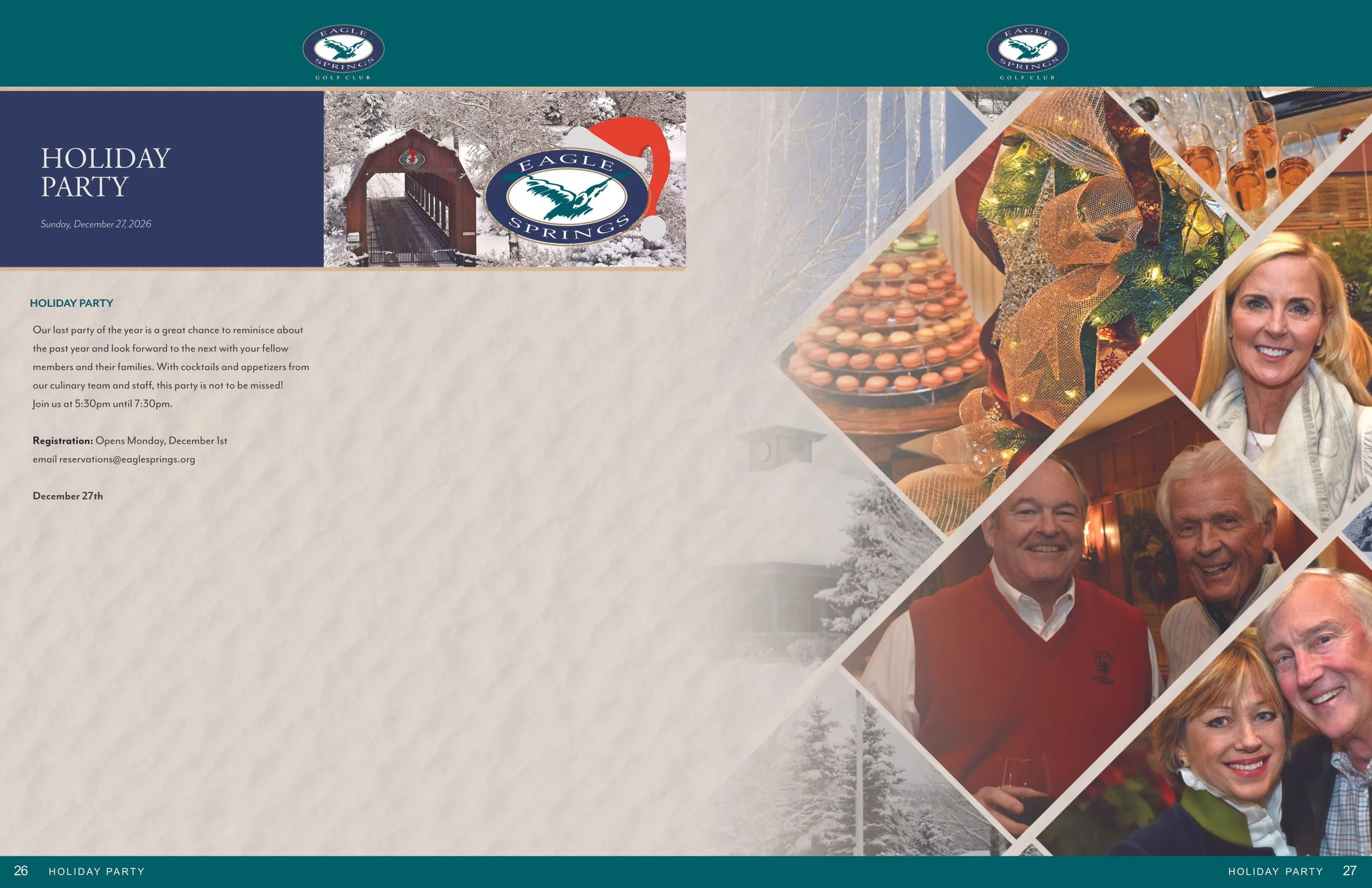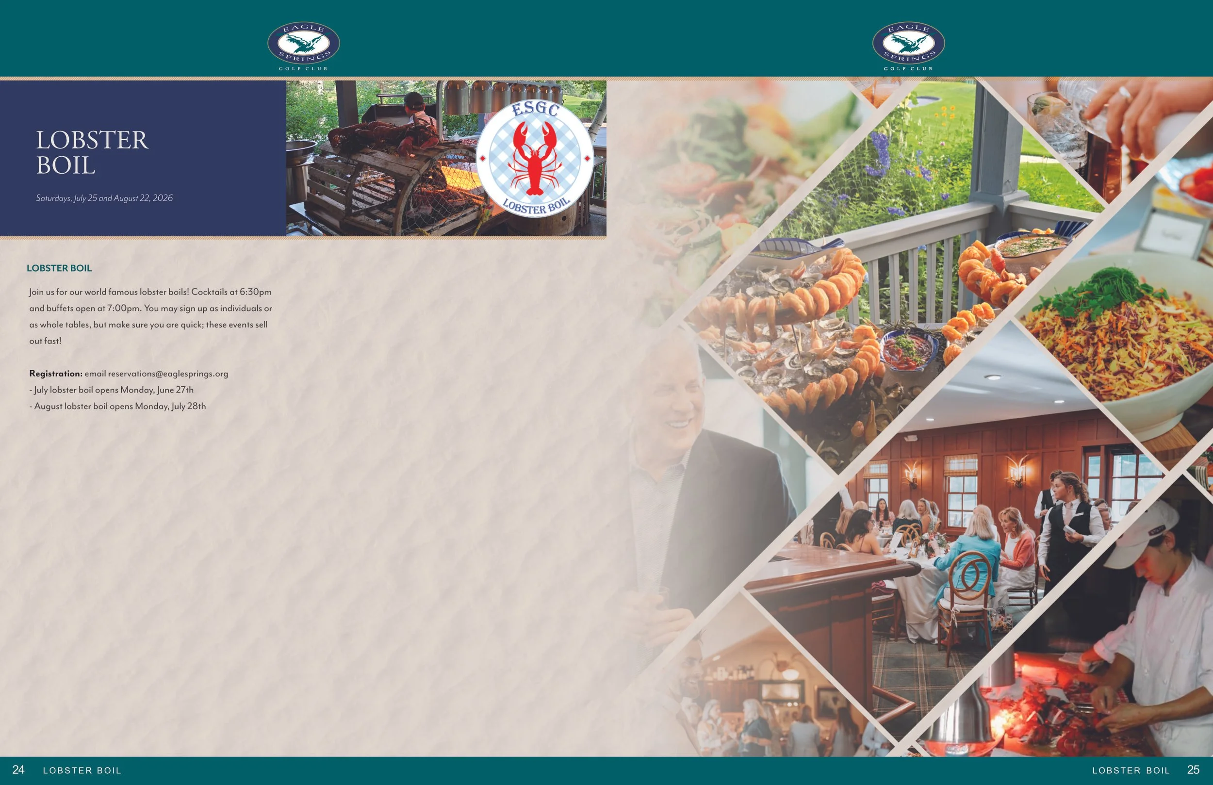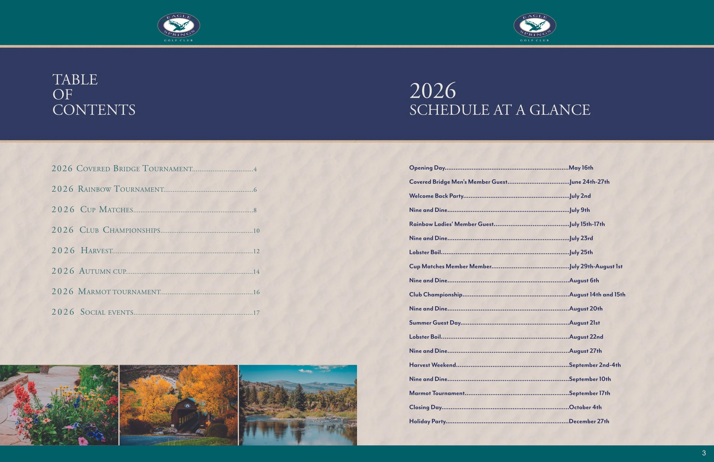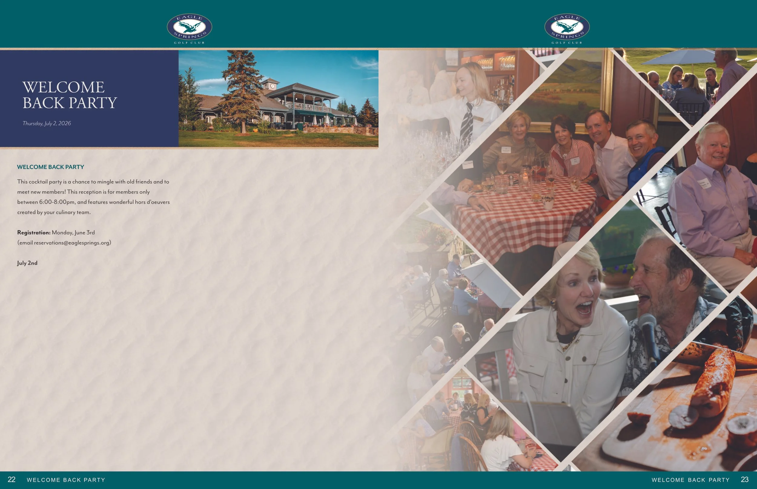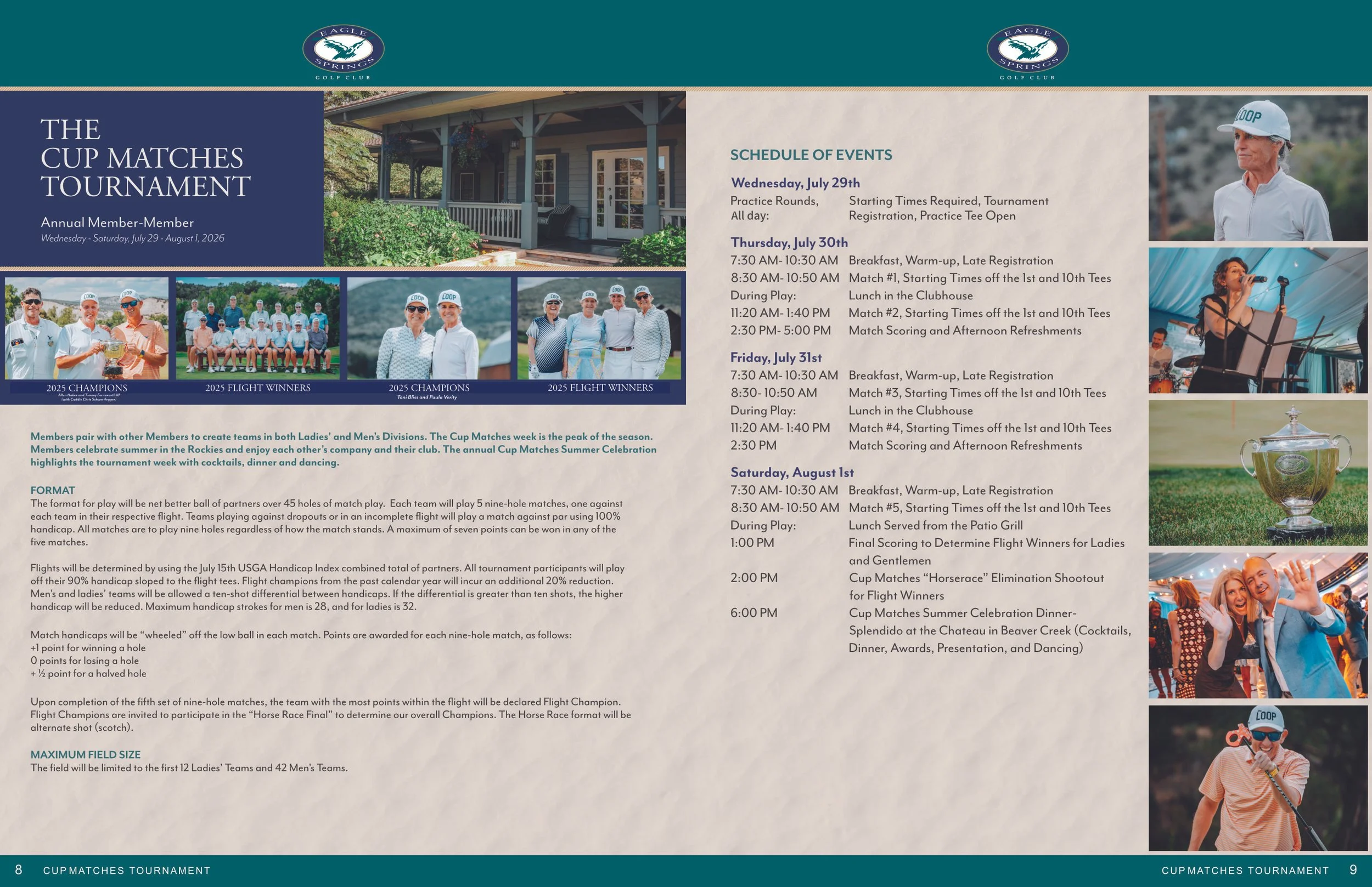 This is a tournament brochure that I worked on for Eagle Springs Golf Club. Much of the work was done by the previous designer, but I made changes where I could. Most of the pictures on the right side of the pages were chosen and arranged by me. I also created the picture collages on the final few pages, with what limited options I had. The front cover was completely designed by me, but the back cover is from the previous version. I also changed the background to something resembling bunker sand.